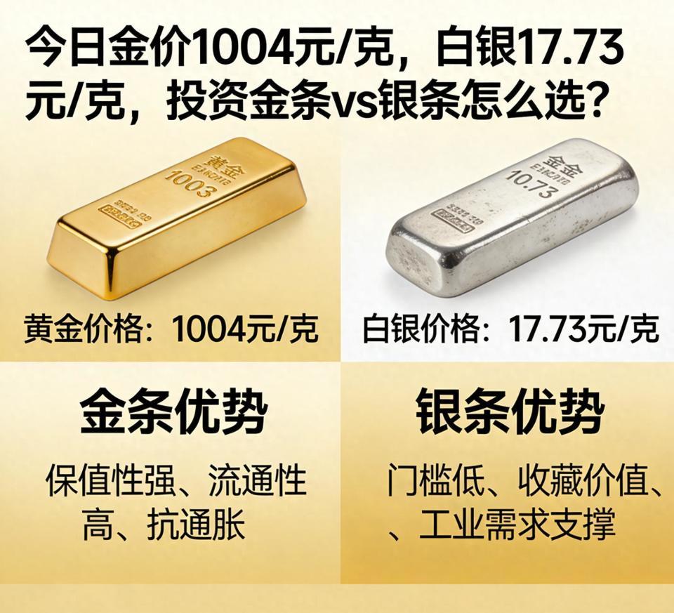 今天(3月30日),黄金价格站在1004元/克,白银17.73元/克。 如果你手头有1万块钱闲钱,是买金条还是买银条?